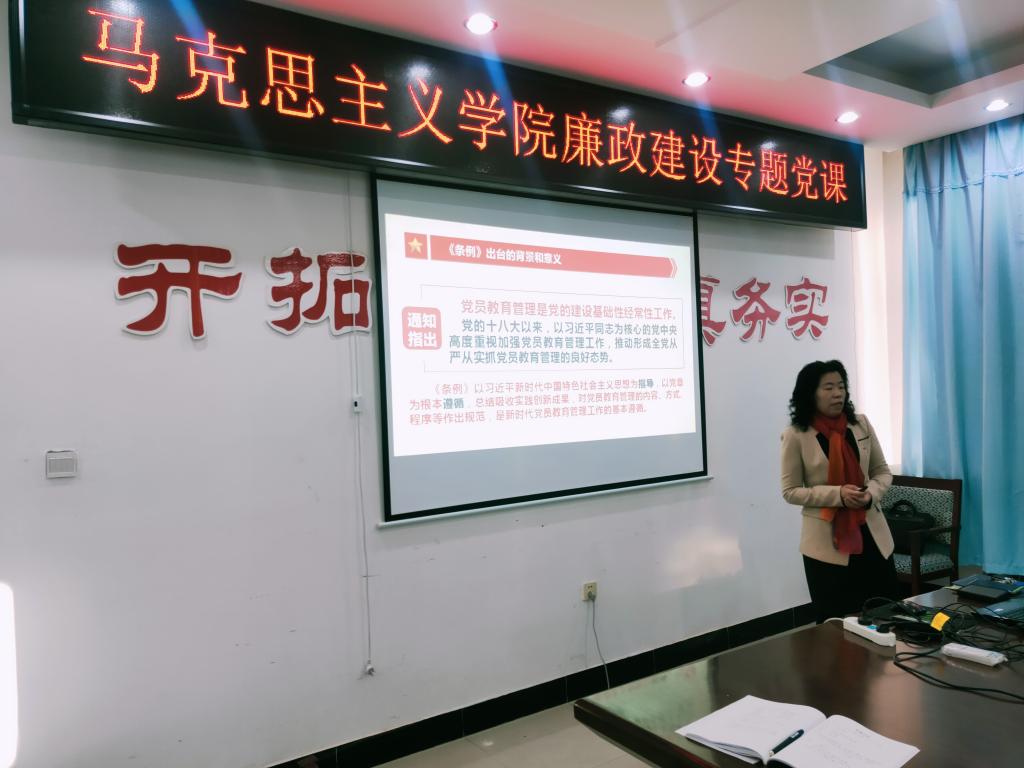 赵书记主要从以下三个方面讲授本次党课。一 是《条例》出台的背景和意义;二 是《条例》的学习贯彻落实;三是 《条例》的逐条学习解读。党课内容深入浅出,有理有据,生动丰富,信息量大。受到了教职员工的一致好评。
