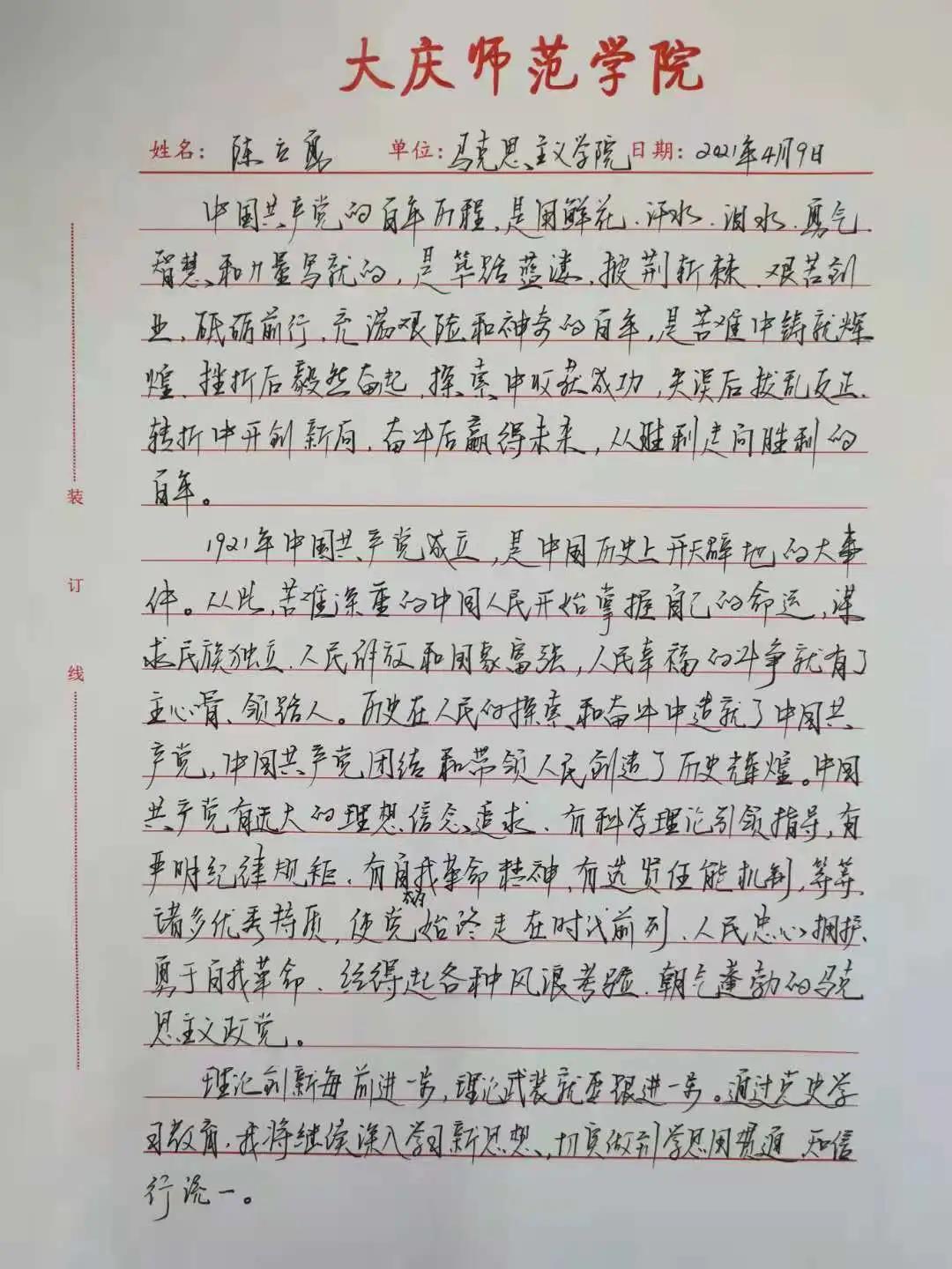 百年大党,历经磨难始就辉煌,百年华诞值得歌颂。历史是宝贵的文化遗产,是丰富的知识宝库,回顾党的历史,更懂今天的不容易,在开启伟大的社会社会主义现代化强国建设的新征程中,更加要信念坚定,无比忠诚,才会开辟未来,交出满意的答卷。回顾党走过的历史光辉历程,能够提高我们对坚持和发展中国特色社会主义的认识,更加增强做好工作的自觉性,对我党辉煌灿烂的革命史、绚丽壮观的发展史、党史都会有了更加切实的感受,并从中受到教育,得到精神上的洗礼,灵魂的震撼。作为一名党员,要牢记初心,不忘使命,时刻发挥党员的先锋模范作用,在自己的本质岗位中尽心尽力,教书育人,传递正能量,以扎实的基本功和人格魅力,身体力行感染员工,需要不断提高自己的业务素质和理论修养。