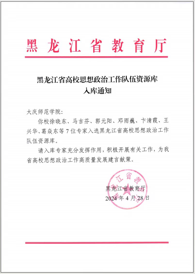近日,黑龙江省教育厅下发了《黑龙江省高校思想政治工作队伍资源库入库通知》,公司有7位专家入选,其中永利yl23411马吉芬、郭元阳2名教师入选。