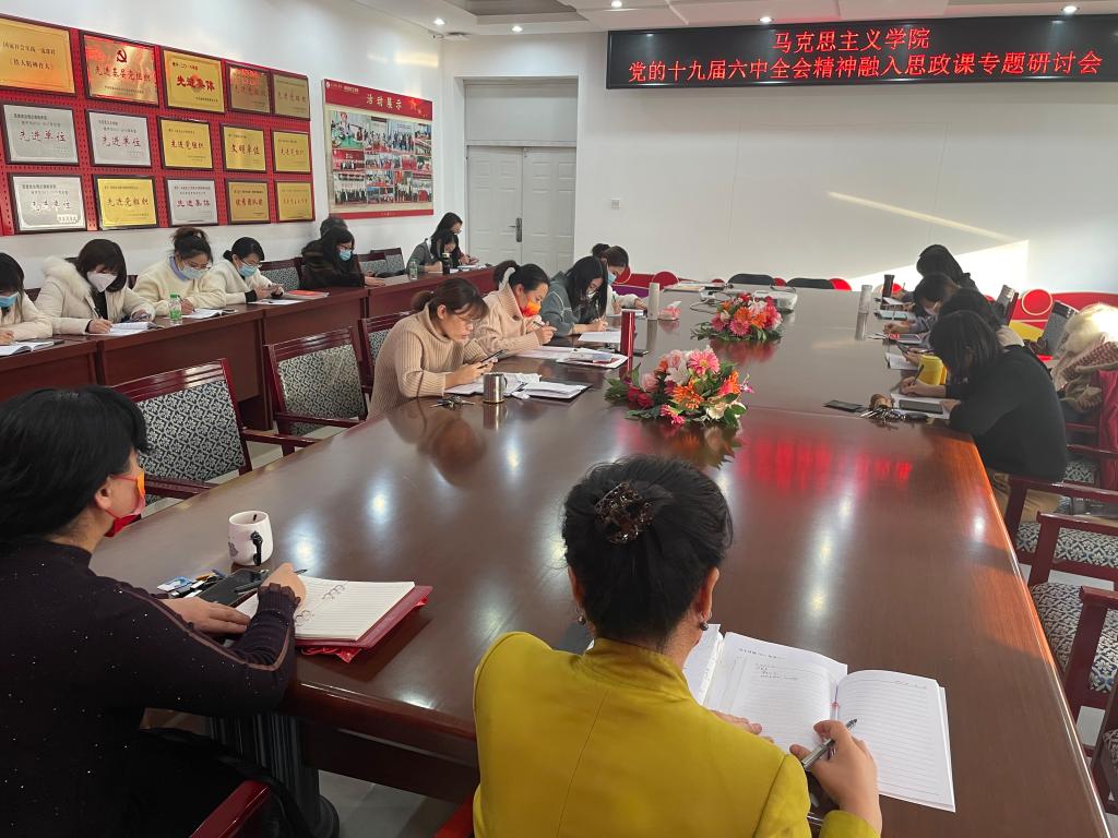 12月15日,下午1点半,永利yl23411全体进行了教职工政治理论学习会议,之后,公司召开了党的十九届六中全会精神融入思政课专题研讨会,会议由党总支书记赵桂英主持,公司六名教研室主任分别作了研讨发言。